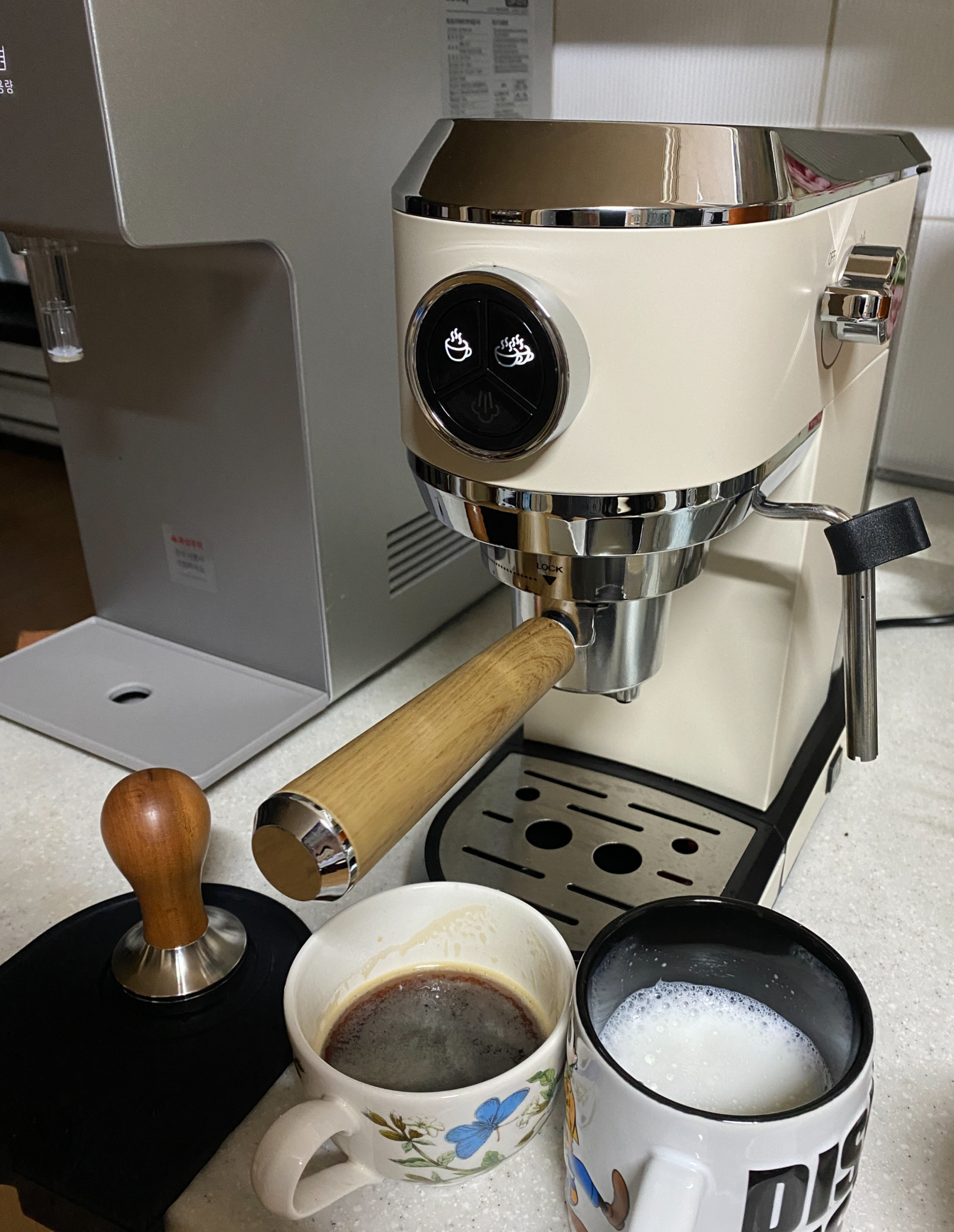 이 제품은 전체적으로 은은한 아이보리 커피머신 톤이라 주방 인테리어 흐름을 깨지 않는 게 첫 만족 포인트였습니다. 메탈이나 블랙 컬러 머신은 존재감이 너무 강한데, 이건 작은 주방에도 과하지 않게 어울려요. 실제로 홈카페 추천템 글들 보면 디자인을 이유로 선택했다는 리뷰가 많은데 그 느낌이 뭔지 알겠더라고요.